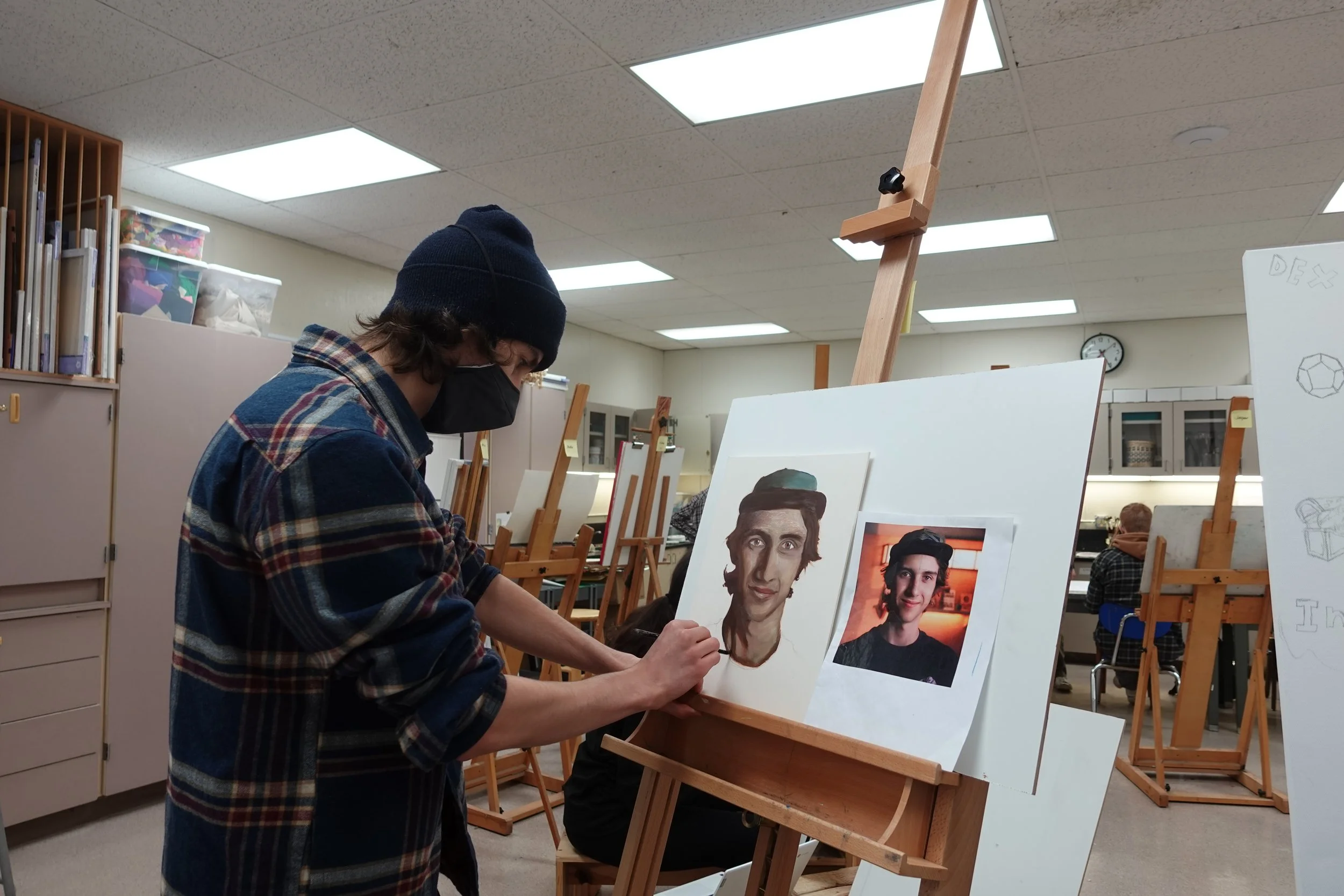 In normal times, students would spend time drawing their own faces from direct observations in a mirror. Unfortunately, this year that wasn't possible with our masks, so photos have become the method of research into their unique countenances. Whether the student chooses to incorporate their likeness in a representational way or not, the process begins with drawing from master portraits, observing the details and proportions of others' faces alongside the direct observation of their own face, and making self-portrait studies and sketches.