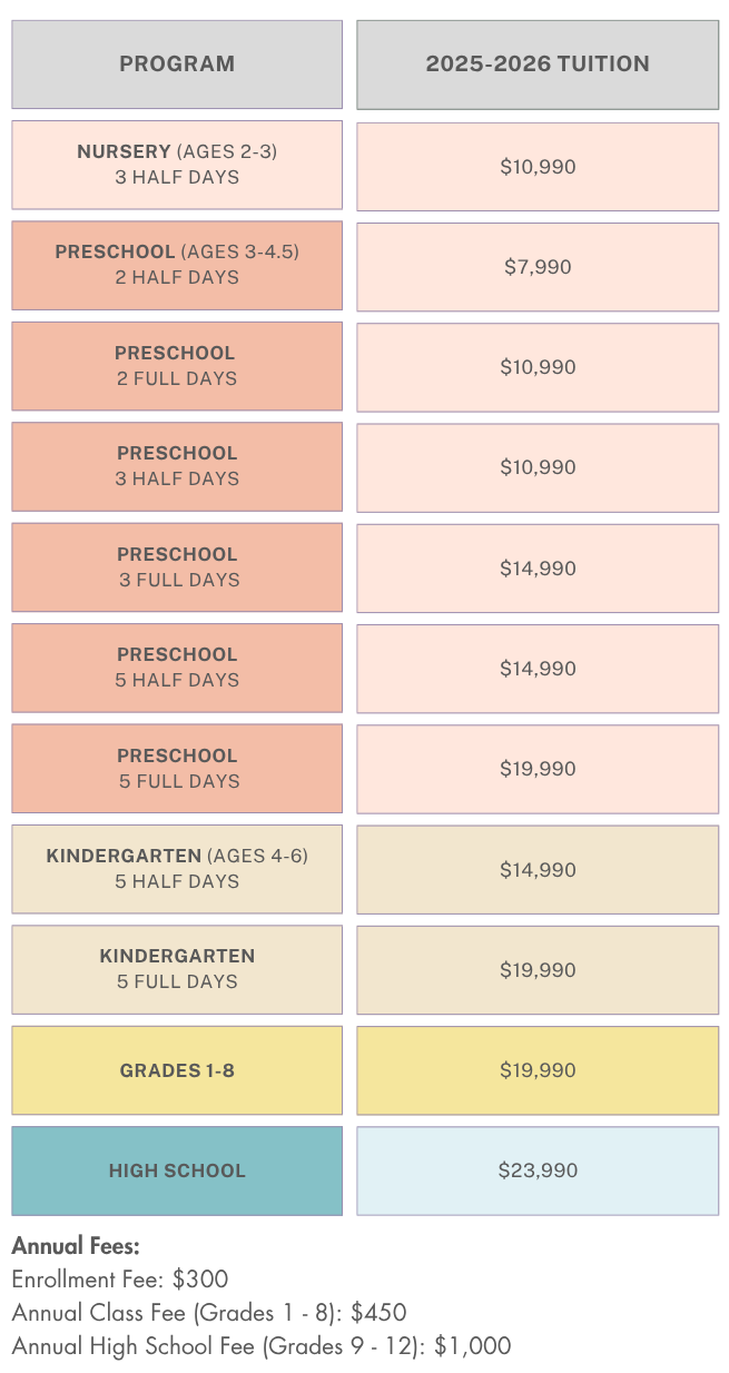 Tuition for mid-year enrollment is pro-rated through the end of the school year. Families can pay monthly, or in a single payment.